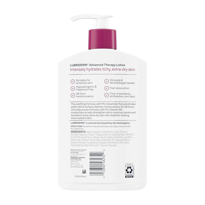 Intensely moisturize itchy, extra-dry skin with Lubriderm Advanced Therapy Fragrance-Free Daily Moisturizing Lotion + Pro-Ceramide. From a dermatologist-developed brand, this moisturizing body lotion for sensitive skin is clinically shown to help moisturize for 48 hours, and transform dry skin into healthier-looking, more resilient skin. Formulated with Vitamin E and Pro-Vitamin B5 plus Pro-Ceramide, this fragrance-free hand and body lotion replenishes and strengthens your skin's moisture barrier. Plus, its fast-absorbing formula is non-greasy with a clean, comfortable feel. The clinically and dermatologist tested hypoallergenic ultra-moisturizing lotion is formulated free of fragrance, parabens, phthalates, and dyes. Smooth the non-greasy lotion on hands and body every day or as directed by a physician.