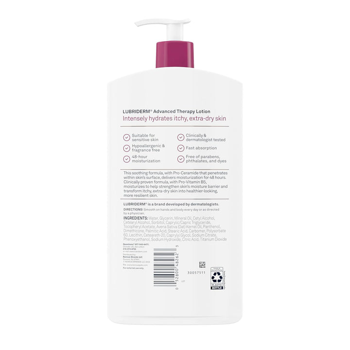 - 24-fluid ounce bottle of Lubriderm Advanced Therapy Fragrance-Free Lotion+ Pro-Ceramide with Vitamin E and Pro-Vitamin B5 to help strengthen skin's moisture barrier and intensely hydrate itchy, extra-dry skin