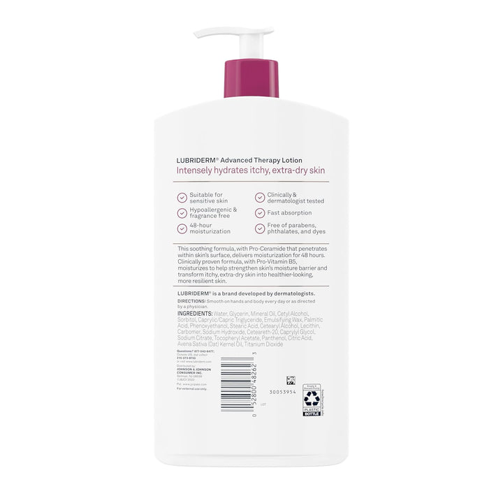 Intensely moisturize itchy, extra-dry skin with Lubriderm Advanced Therapy Fragrance-Free Daily Moisturizing Lotion + Pro-Ceramide. From a dermatologist-developed brand, this moisturizing body lotion for sensitive skin is clinically shown to help moisturize for 48 hours, and transform dry skin into healthier-looking, more resilient skin. Formulated with Vitamin E and Pro-Vitamin B5 plus Pro-Ceramide, this fragrance-free hand and body lotion replenishes and helps strengthen your skin's moisture barrier. Plus, its fast-absorbing formula is non-greasy with a clean, comfortable feel. The clinically and dermatologist tested hypoallergenic ultra-moisturizing lotion is formulated free of fragrance, parabens, phthalates, and dyes. Smooth the non-greasy lotion on hands and body every day or as directed by a physician.
